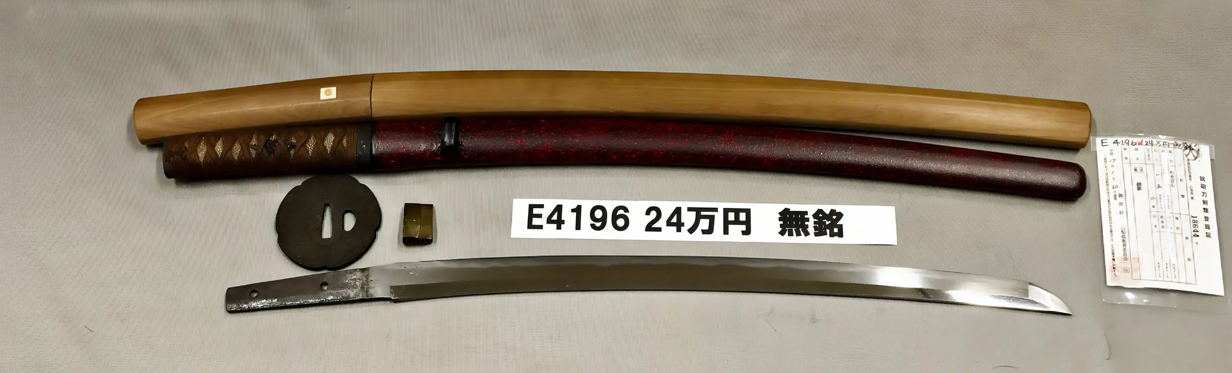 拵は黒地に赤のまだら模様の鞘、梅花形の鉄ツバ、梅模様の縁金と、「梅」尽くしの意匠が印象的。梅は古来、寒中に咲くことから「忍耐」や「再生」を象徴し、武家に好まれた文様でした。銅二重ハバキも丁寧な仕上げで、当時の上質な仕事を物語ります。