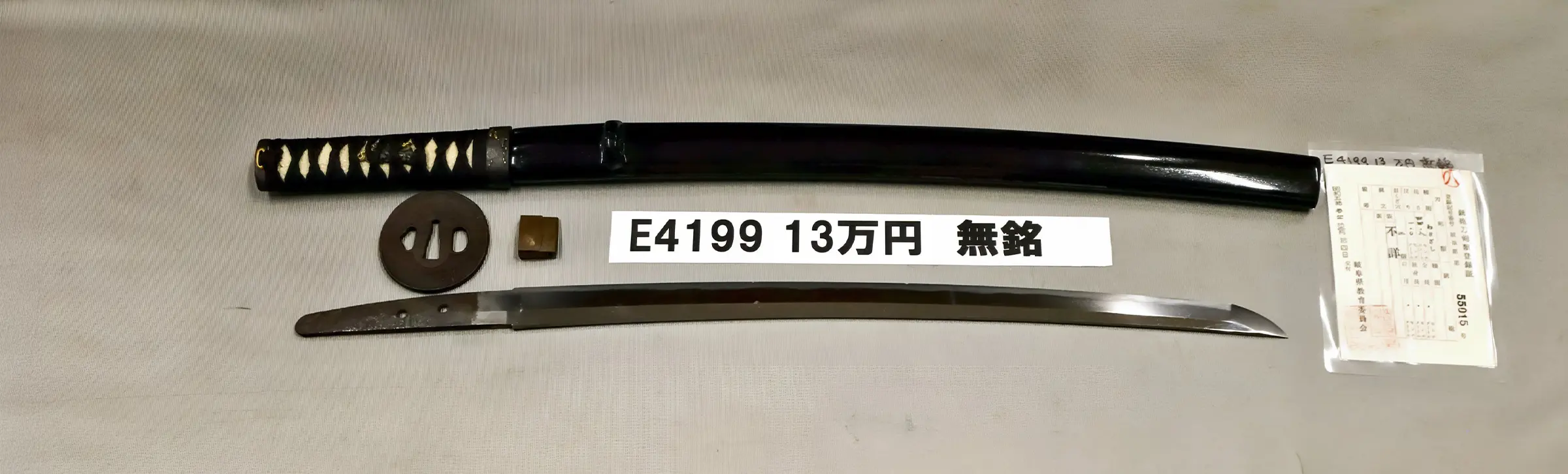 外装は黒塗りの艶鞘に丸形鉄ツバを合わせ、落ち着いた品格を感じさせます。銅二重ハバキが丁寧に装着されており、刀身との調和も美しい仕立てです。刃こぼれが数ヶ所見られるものの、これは実戦での使用痕跡を伝える「歴史の証」であり、むしろこの時代の刀のリアルな姿を今に伝えています。