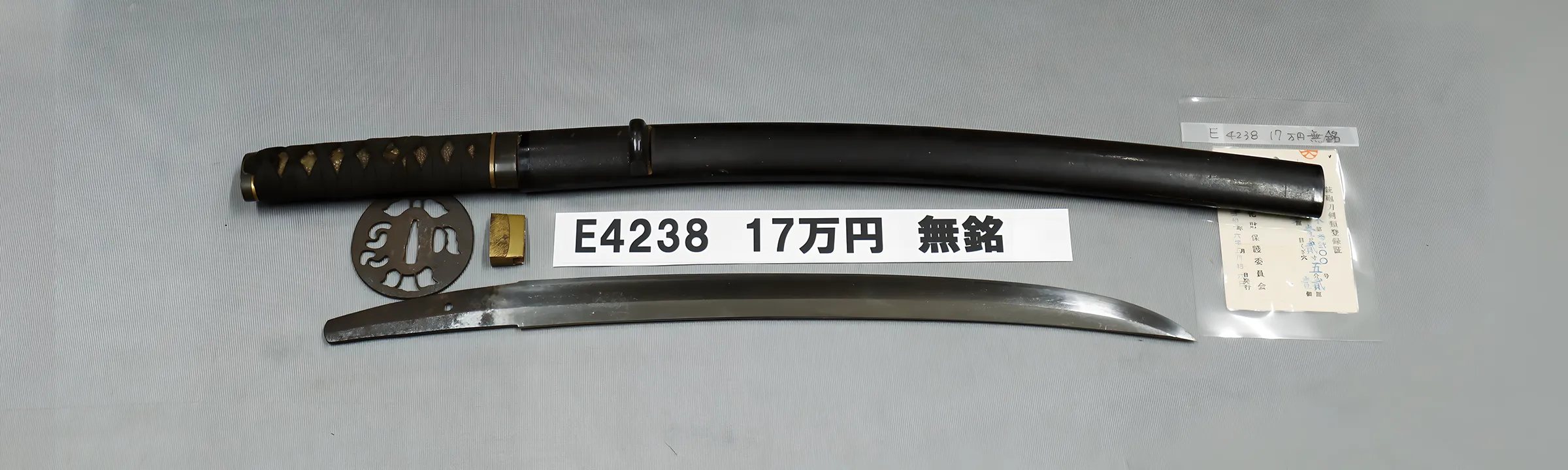 刀身は無銘ながら、板目肌が美しく流れる鍛えを見せており、当時の実戦的な作刀傾向が伺えます。刃文は落ち着きのある「直刃(すぐは)」で、小切先へと続く端正な仕上がりです。茎(なかご)は作られた当時のままの形を保つ「生茎(うぶなかご)」であり、栗尻の形状も良好です。金色台付のハバキが、刀身の品格をより一層引き立てています。
