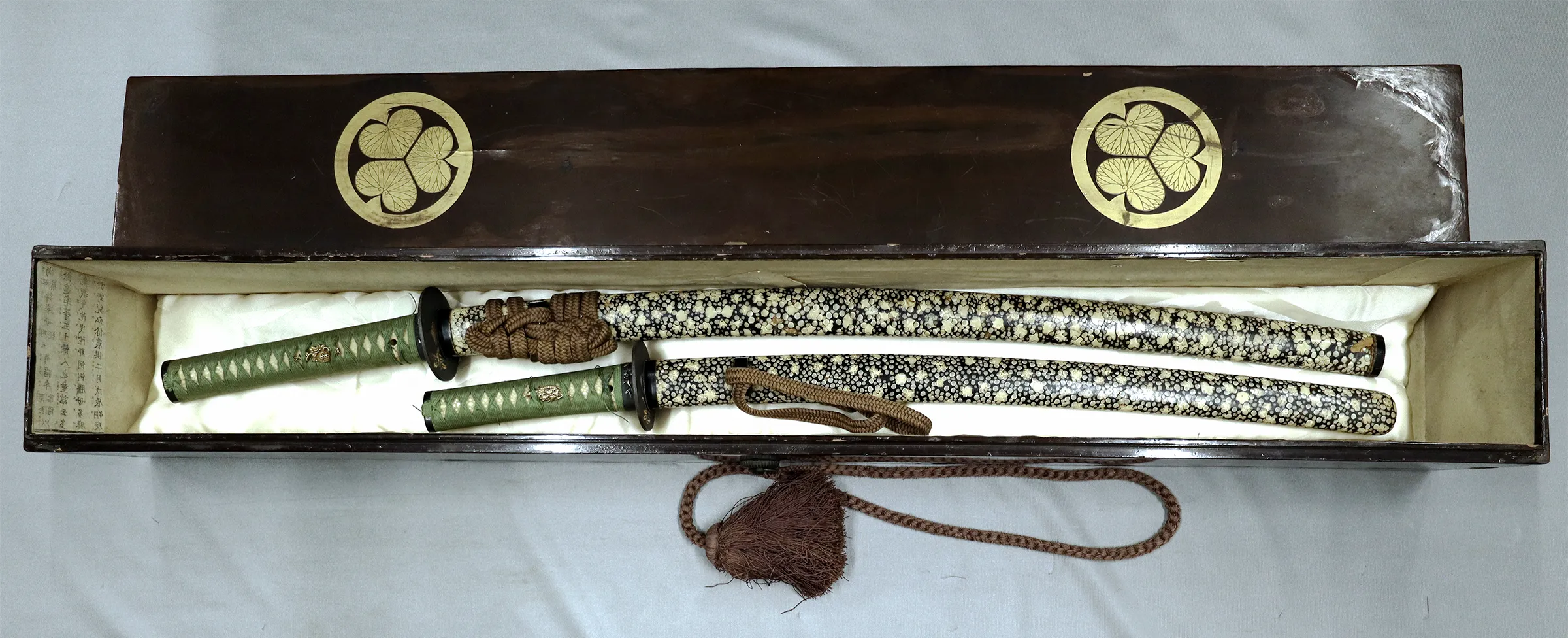 後藤光美の金具から三つ葉葵紋の塗箱まで揃って伝わる同一刀工・同年紀の大小は、江戸末期の工芸と精神文化を今に伝える希少な一具です。