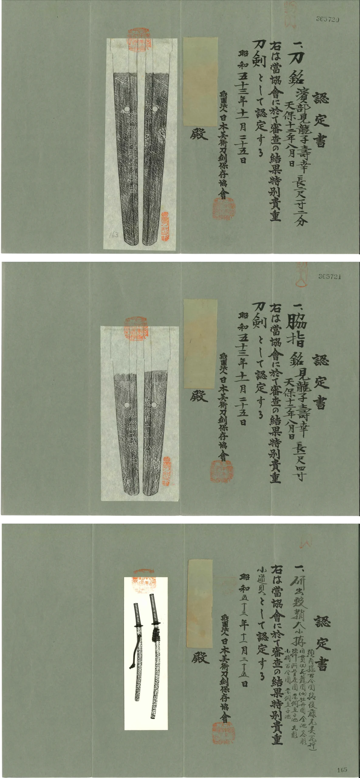 状態は大小ともに錆・刃こぼれなく良好です。鞘に大刀は直径1〜1.5cmの塗りの剥がれが3箇所、小刀は約3mmの剥がれが1箇所見られますが、経年を考慮すれば軽微な範囲です。大小の刀身および拵のいずれにも日本美術刀剣保存協会の特別貴重刀剣認定書が付属しており、品質と来歴の裏付けとなっています。